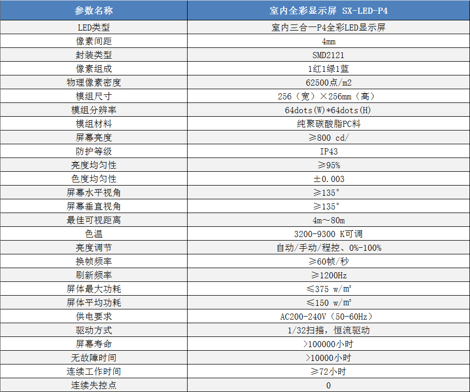P4室內小間距高清全彩LED顯示屏技術參數: